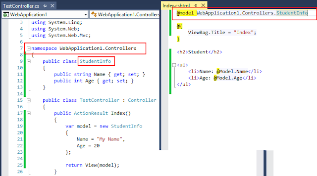 Theo như trên, để truy xuất thông tin được truyền từ Controller ta sử dụng @Model, đây chính là đối tượng được truyền từ Controller thông qua lệnh return View(model);